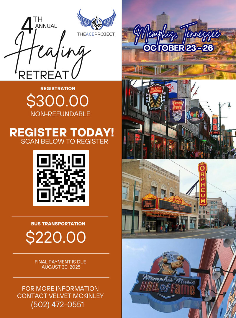 Join us in celebrating 11 years of compassionate service at the 4th Annual “The Ace Project Survivors Healing Retreat” in Memphis Tennessee from Oct 23, 2024 to Oct 26, 2025!